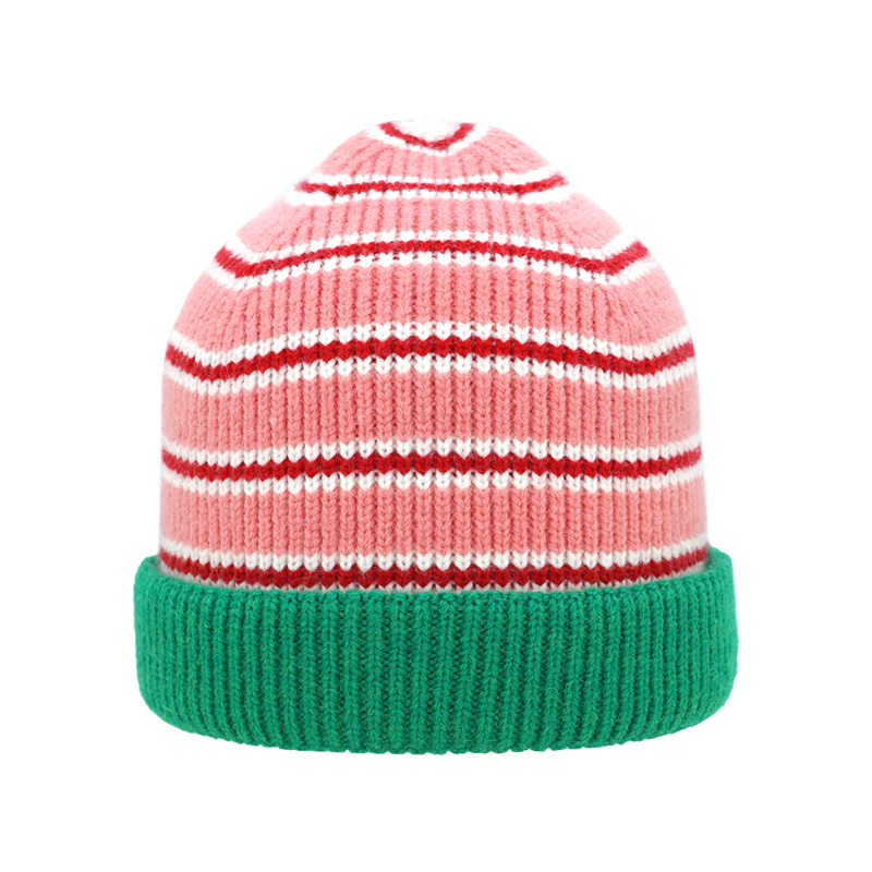 Striped Girl Knit Beanie Hat with Contrast Fold Cuff